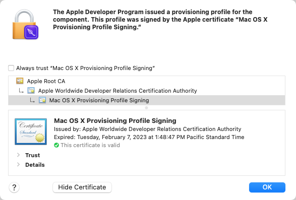 - The applicable trust settings policy is an Apple-defined collection of requirements for trusting a certificate for a specific purpose. Apple X.509 Basic Policy is the most generic, and is generally fulfilled as long as the certificate chain leads to a trusted “anchor,” e.g. in the System Root keychain. Use the pop-up menu to see other common trust policies, or to enter a custom trust policy OID. Some trust policies add more stringent root certificate requirements (mostly, that it be an Apple Root CA), or more specific pinning requirements. Trust policies might also require specific extensions to be present on a certificate, indicating that Apple issued it for a specific purpose — such as Developer ID signing, or App Store signing.